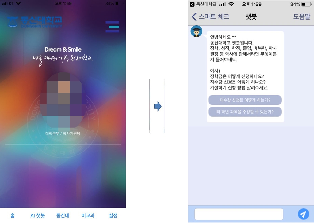 동신대 재학생들이 동신대 앱을 깔고 로그인한 뒤 ‘AI 챗봇’ 아이콘을 클릭, 채팅창을 통해 질문하면 인공지능 챗봇이 시간과 장소에 구애받지 않고 24시간 답변을 한다.