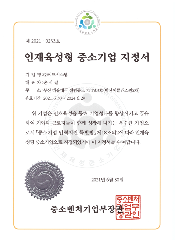 씨드시스템이 인재육성형 중소기업으로 지정되었습니다.